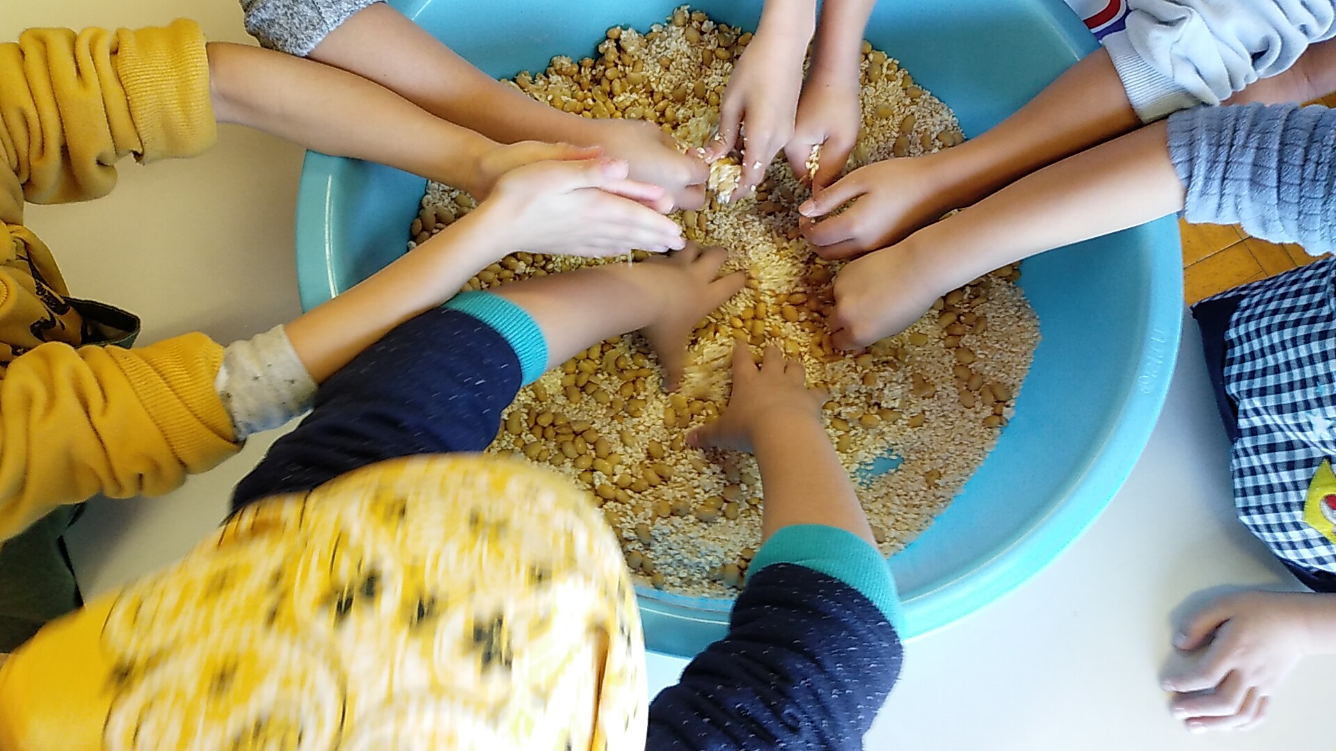 説明が終わっていよいよ味噌作り。家庭科室に移動して準備。材料は大豆、塩、麹。塩と麹を混ぜ混ぜして、それから茹でた大豆をぶっ込みます。混ぜるほど麹の香りが強くなります。