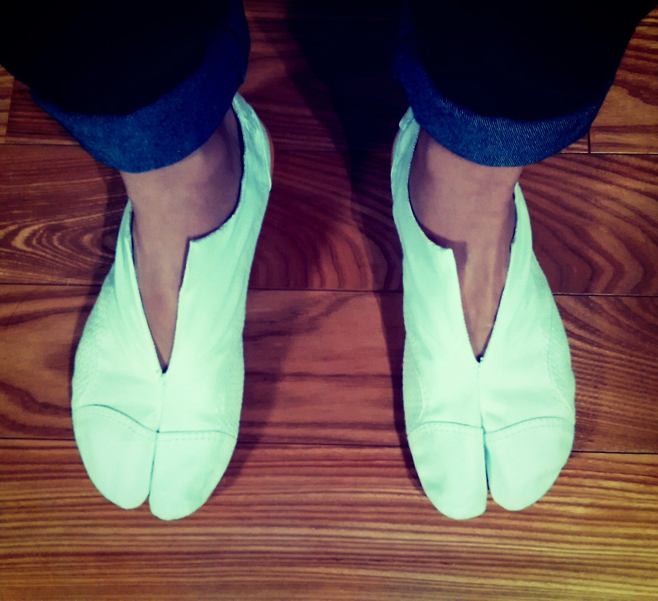 オリジナルの足袋は試作品を含め7足目。ベースの地下足袋の選び方や、足に合わせた布の切り方など、だいぶ要領が掴めてきました。フィット感は、今までで1番良い感じ。