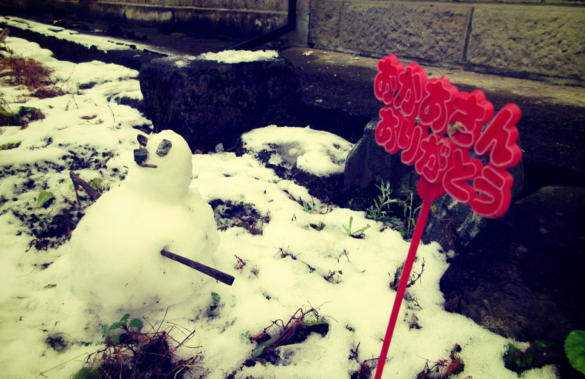 カミさんが外に行ってみると、冒頭写真、雪だるまと”おかあさんありがとう”の飾り。カミさんはとても感激したようです。