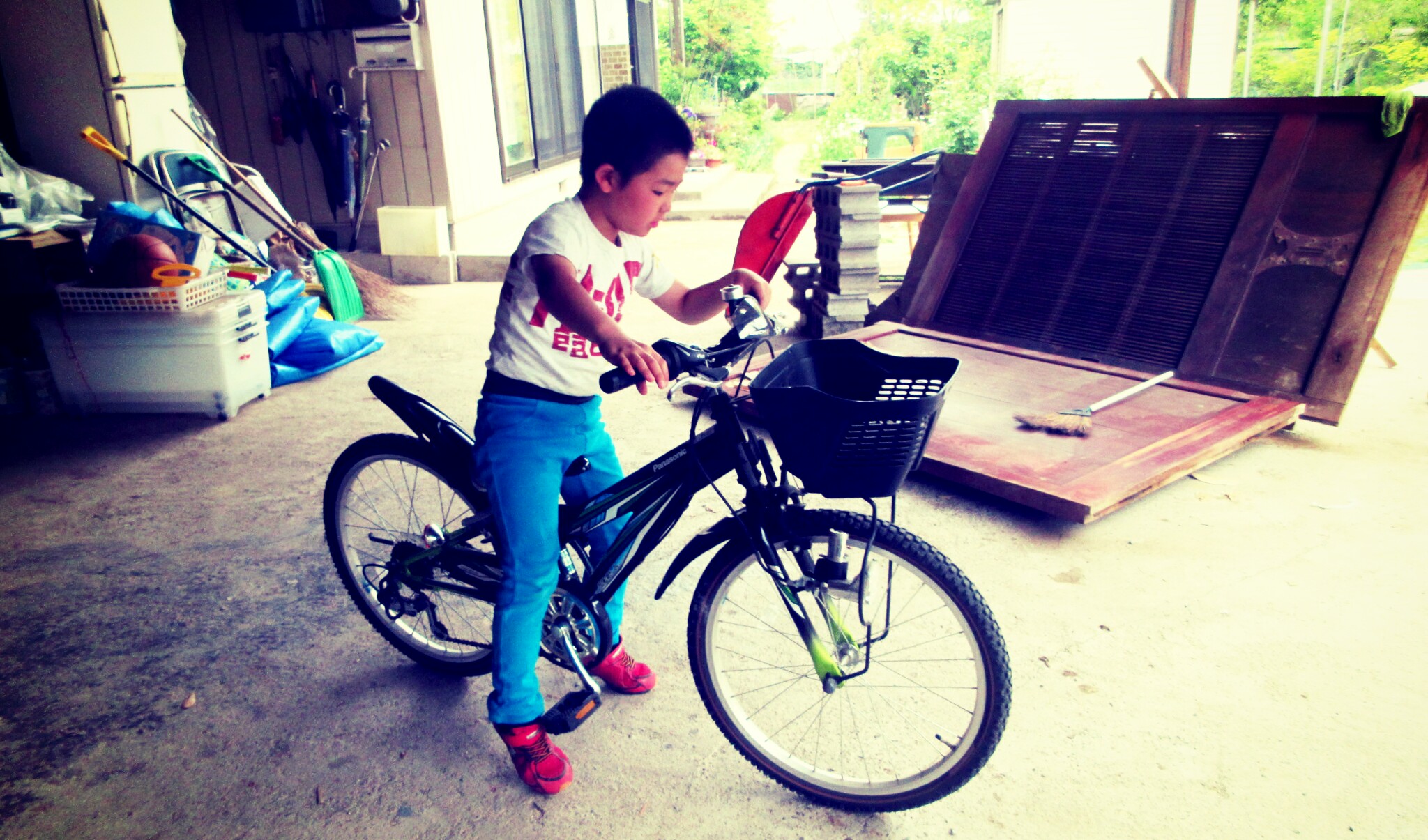 小学生になった長男は、親戚から譲受けた大きめの自転車に乗りはじめました。天気が良い日は、半袖で汗をかきながら遊んでます。
