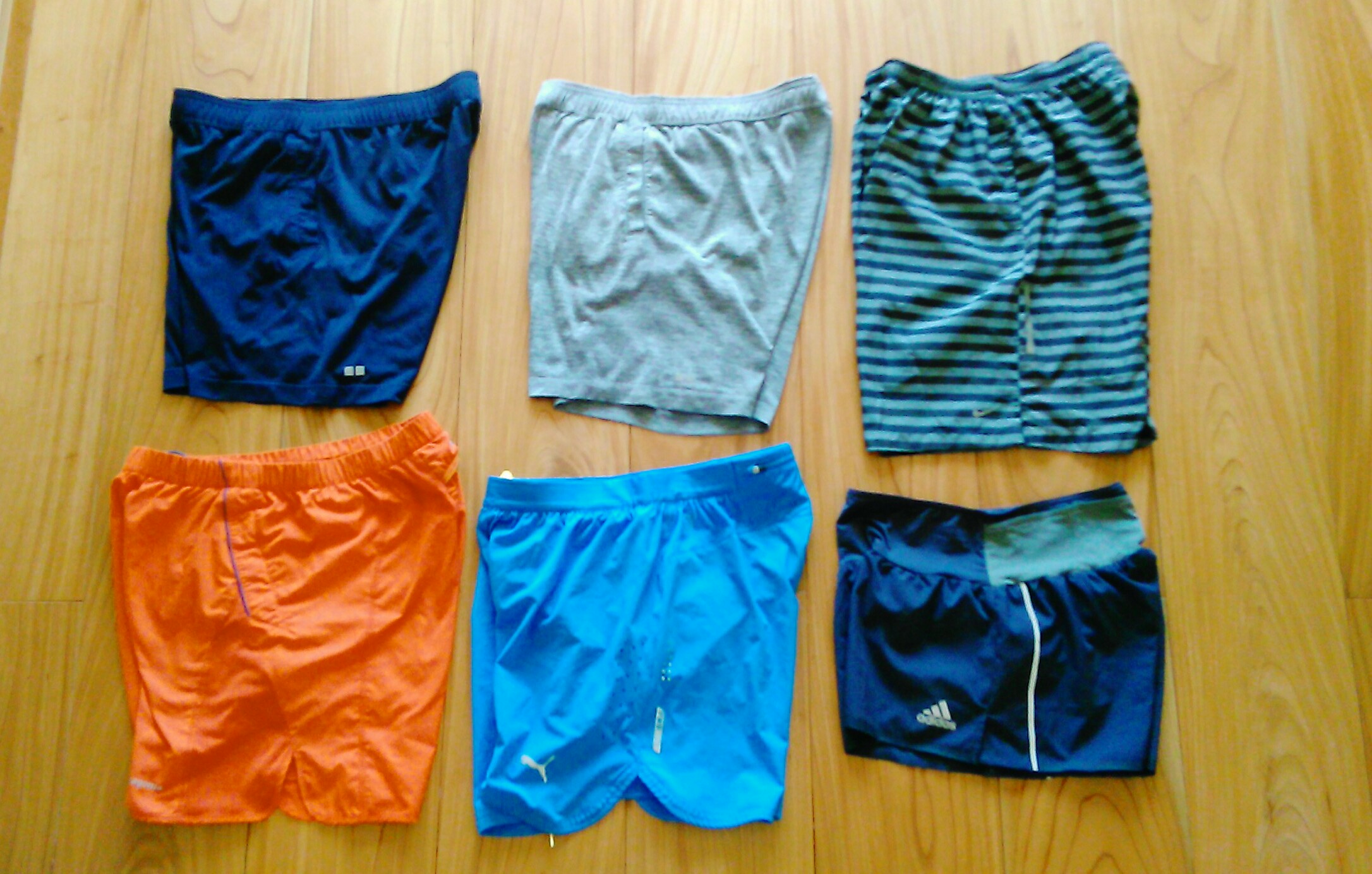 私が練習で使用している短パンは冒頭写真のモノです。速乾性で、丈は短め。股下15cm前後のモノが多いかな。上段右端のシマシマが1番丈が長く、秋口の寒さの中で、タイツと併用したりしてます。