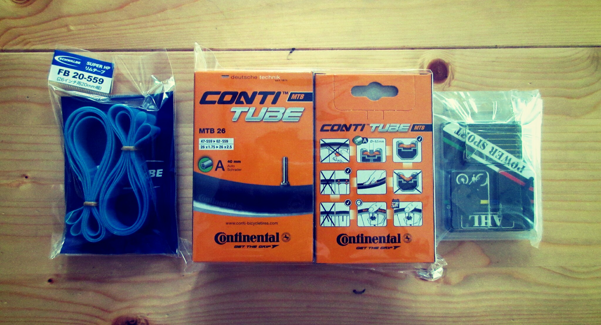 購入した部品は、タイヤ、チューブ、リムテープ、ブレーキパッドの四品目。午後からは作業開始です。