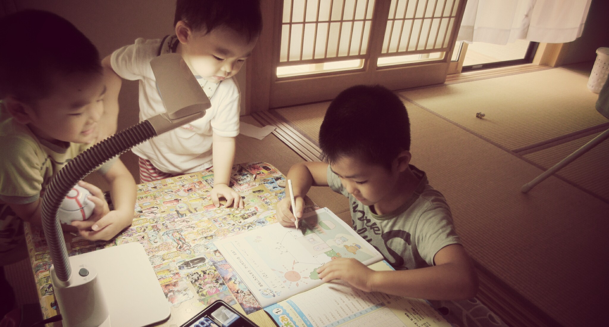 その様子を興味津々に見つめる弟たち。音読の宿題などもあり、なかなか大変ですな。