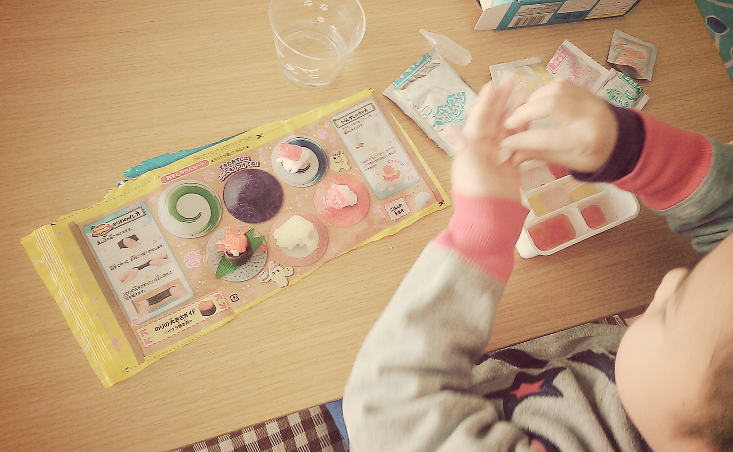 家に帰ってきて、昼食を済ますと、さっそくお寿司のお菓子の箱を開ける。箱からシャリ、マグロ、玉子、いくらの素となる粉を几帳面に並べて、お寿司作り開始。