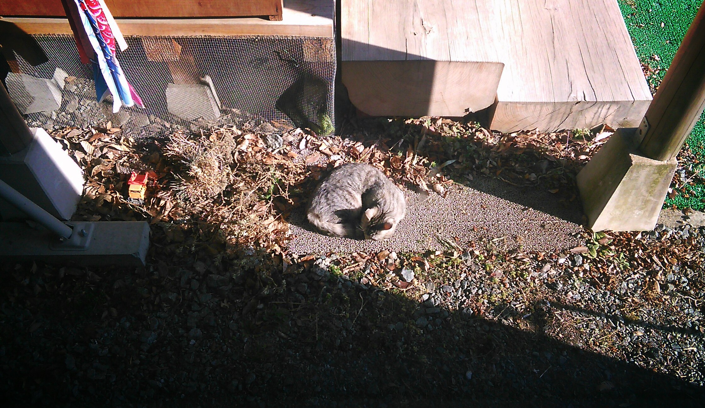 最近、家の勝手口に代わる代わる猫がひなたぼっこにやってきます。風が当たらなくて、日も当たるこの場所が暖かいようです。次男がばーちゃんちから戻って来るときも逃げずにいたそうで、次男は「かわいいけど、目がギンギラで少し怖い、、、」と言っている。本能的な反応ですね。
