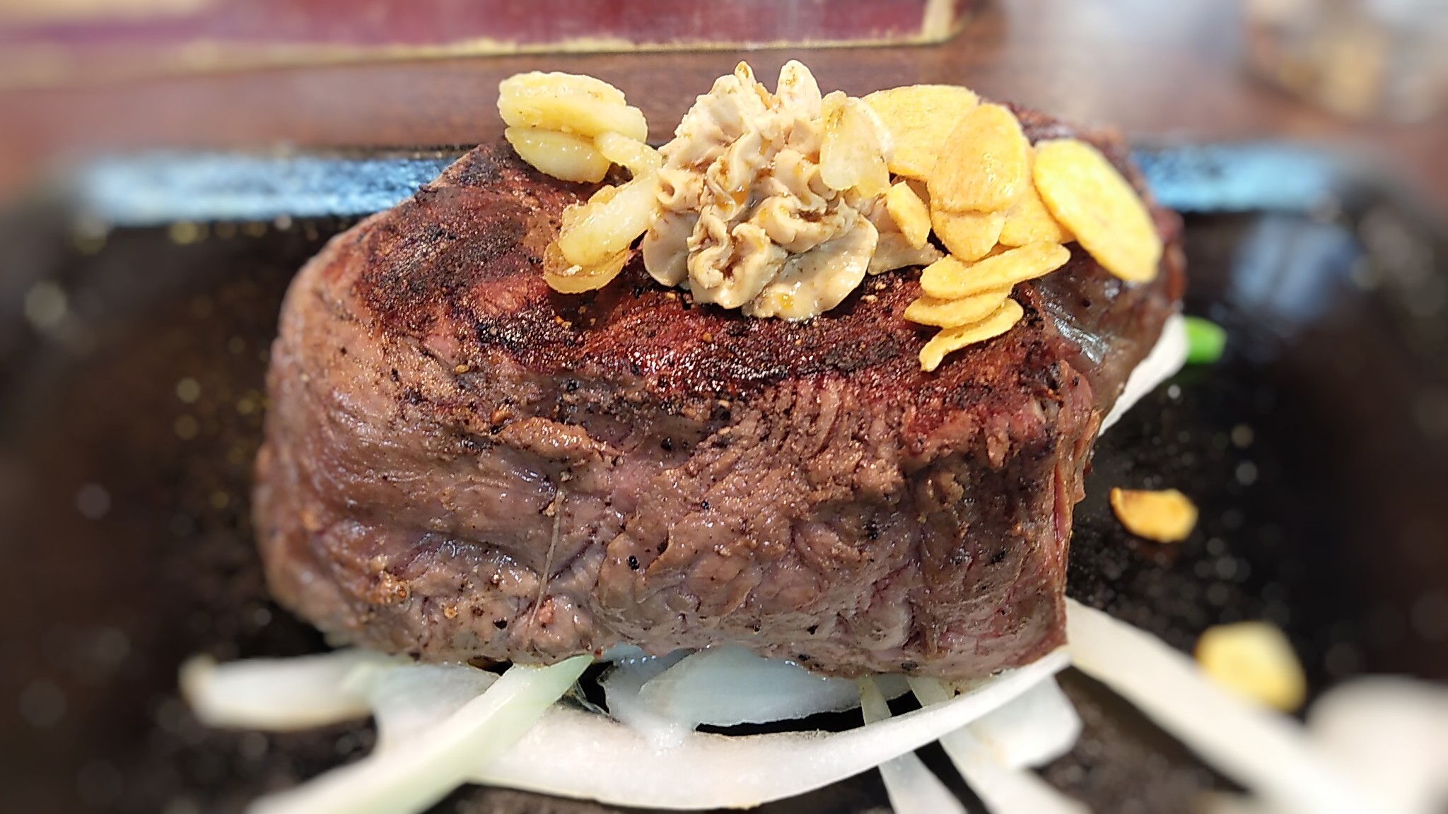 前回はリブステーキを食べたのですが、けっこう筋っぽかったので、最初に食べて美味しかったヒレステーキを注文。気合いの300g。厚みが迫力ありますわ。三男はお子様ハンバーグ。前はお子様メニューは無かったような気がします。こどもがいる家庭には嬉しいメニューですね。