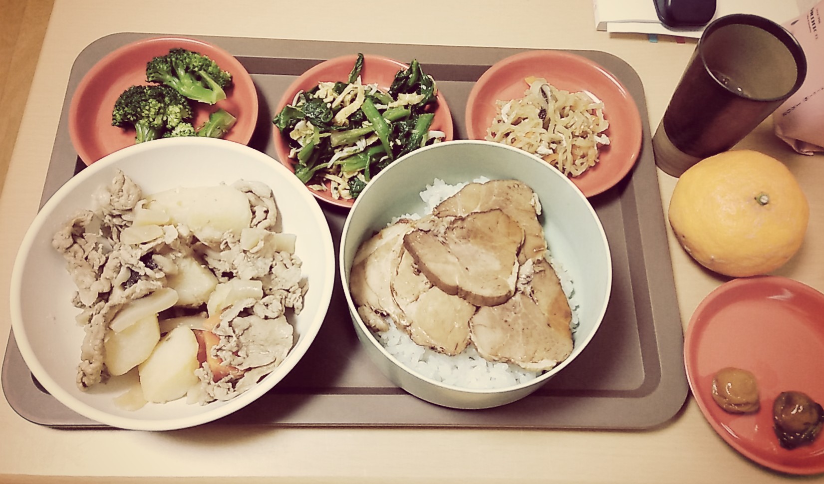 さて。帰り際に母親から手料理のお土産をたくさんもらった。肉じゃが、おひたし、煮物などなど。一週間で食べきる前に、悪くなってしまうのではないかというぐらいの量。大変助かりますわ。仙台の宿舎に到着して荷物の整理をしていると、同じ職場の先輩から連絡が入る。先輩の地元の友達が作っているというチャーシューをお土産にもってきてくれました。いやー、嬉しいです。ありがとうございました。せっかくなので、米を炊いて、炊き立てのご飯の上にチャーシューを乗せ、タレもかけていただきます。おお、美味しい!しっかりとした肉に、深みのあるタレがしみていてご飯が進みました。ちょっとスパイシーな薬味が効いている。山椒かな?
