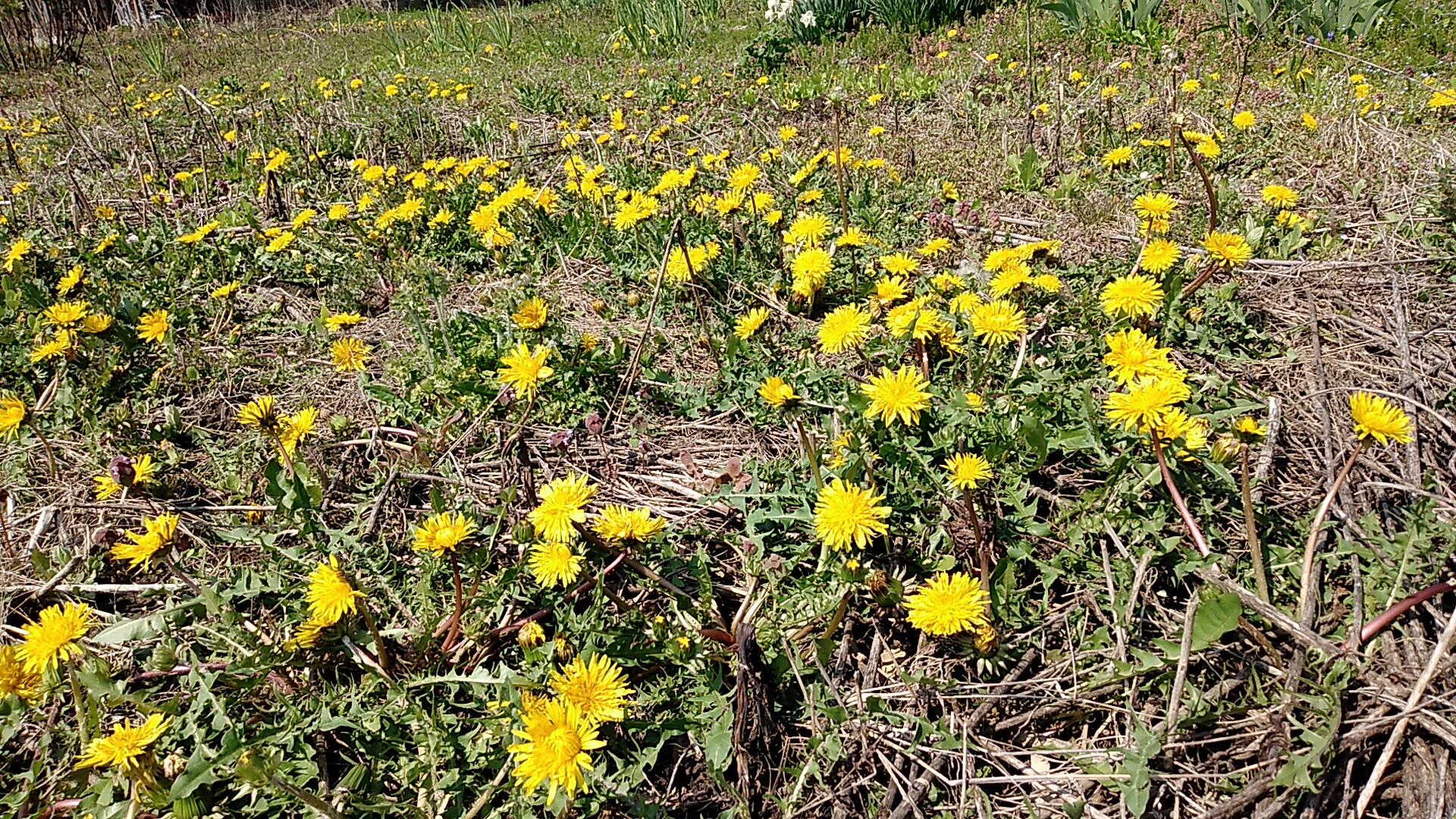 裏の畑に行くと、一面にタンポポが咲いていて春らしい光景。でも、風はまだまだ冷たくて、散歩するには寒いかも。気温が上がれば子どもたちとお散歩に出かけたいと思います。