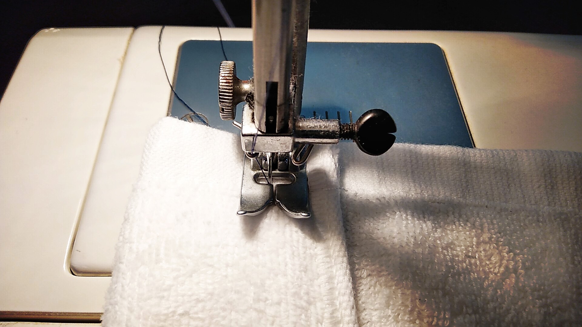 と言うわけで、まずは子どもたちがプールの着替えをするためのタオルスカートの製作開始。あまり使ってなかったマラソン大会の大きなタオルを使用します。ゴムを通すループを作って、スカートになるよう両端を縫い合わせる。タオルの大きさに苦戦しながらも、2つ完成。