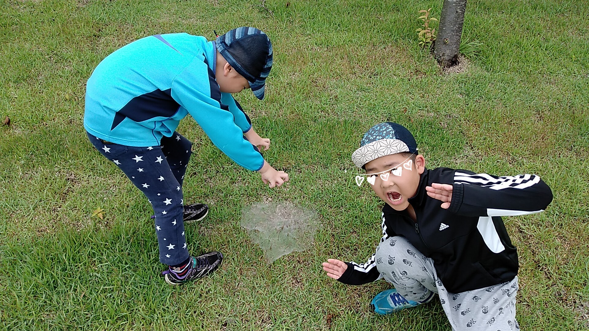 昨日まで涼しかったので、今朝も長袖長ズボンで出かけたのですが、思いの外、気温が高い。長男、次男ともに頭から汗を流していた。いつもの遊具で身体を温め、陸上競技場に向かうと、村の駅伝チームが練習中でした。秋の市町村駅伝に向けた練習。邪魔にならないように競技場の端っこをちょこちょこと走ったり、叫んだり。途中、芝にあったクモの巣を見つけ、デカいのを探しながら競技場を回ります。