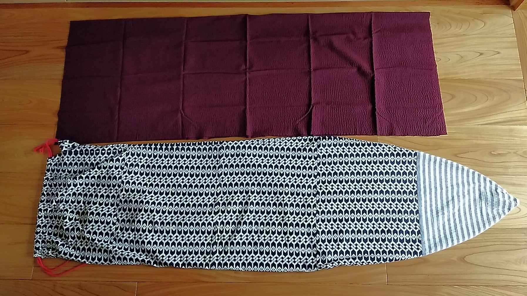 というわけで、昨年購入したサーフボードのために作ったケースがピチピチ過ぎて出し入れに苦労していたので、新たに作ってみることにしました。冒頭写真の下がピチピチのケース。昨日、手芸店で安く手に入れた紫の布で作ります。布の伸縮性も重要です。
