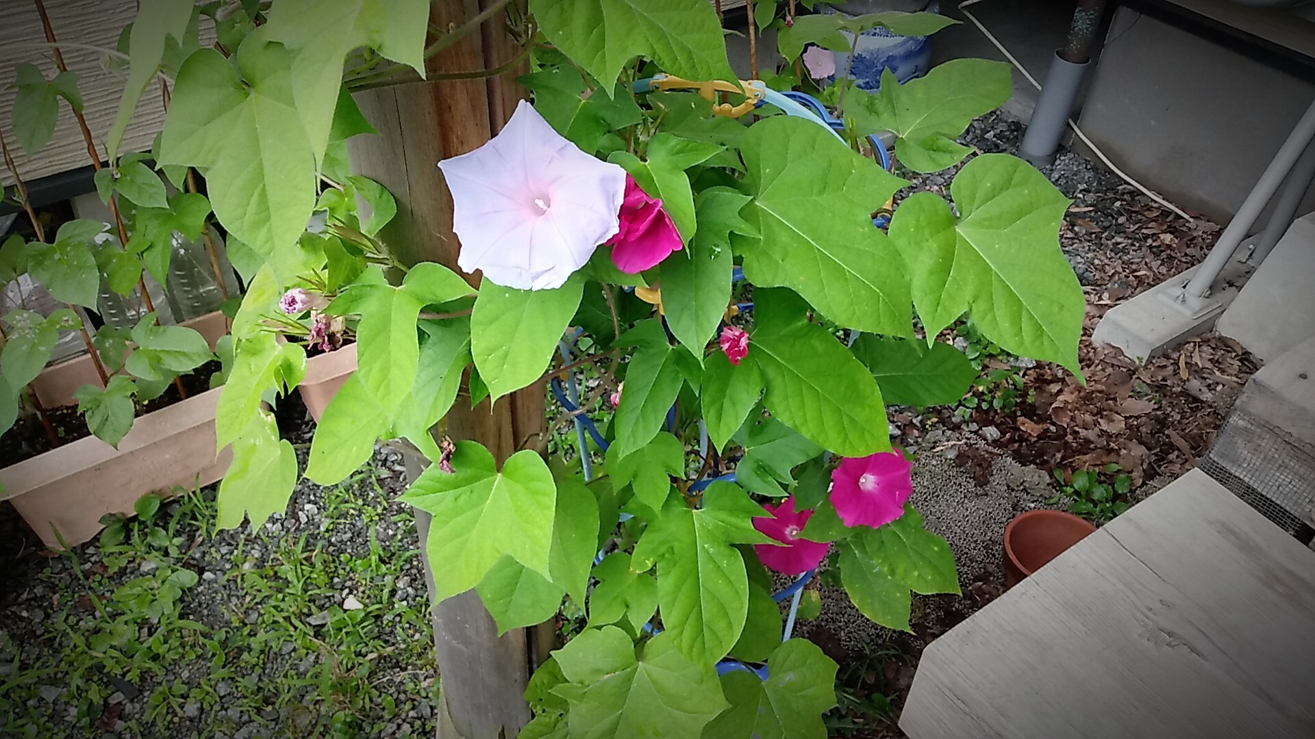 子どもたちが夏の初めにまいた朝顔の花が咲き始めました。次男の朝顔は小学校からもらってきた種で、他は昨年の朝顔から取った種。小学校からもらってきた種のほうが育ちがとても良い。昨日、次男は宿題だった観察日記を書いていました。なんか、夏ですね。