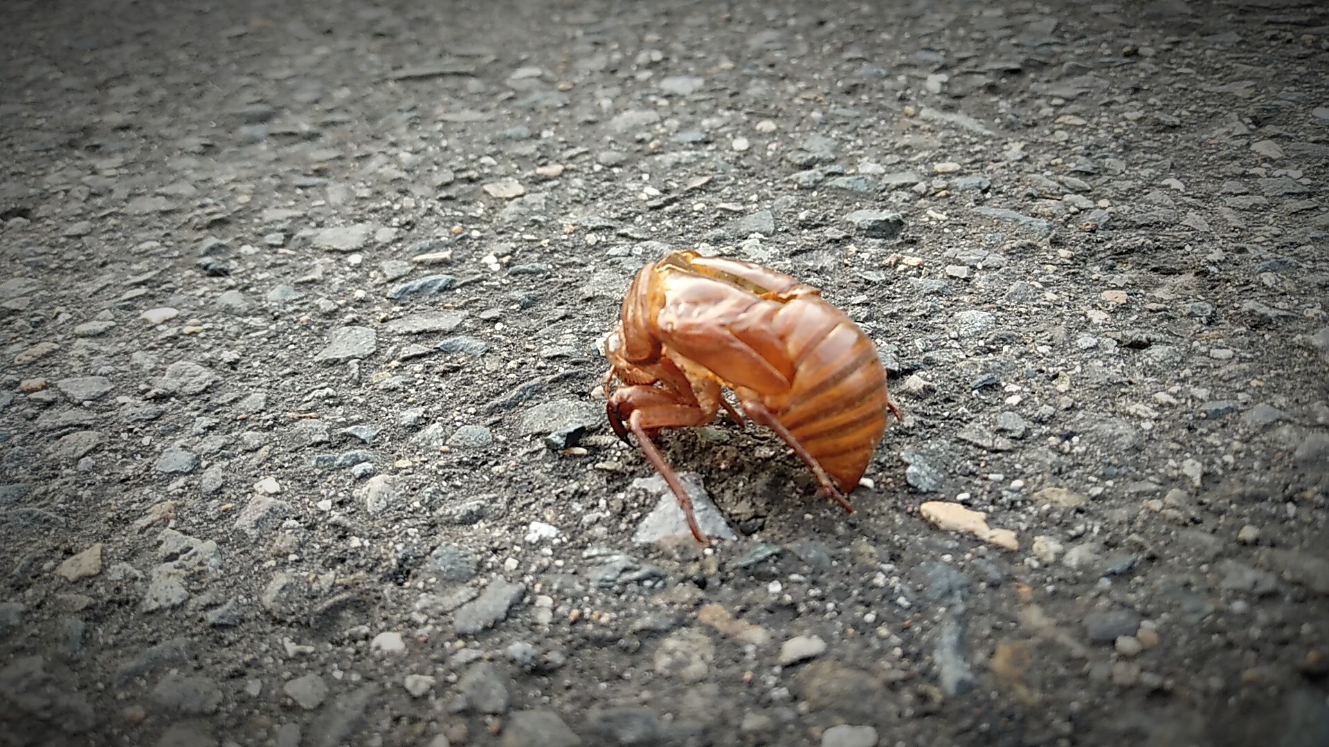 しばらく滑っていたら、駐車場の真ん中に茶色い小さな物体を見つける。よく見たらセミの抜け殻だった。やっと夏が来て、セミも元気に地上に出てきたようですね。一週間、命果てるまで鳴いてくださいな。