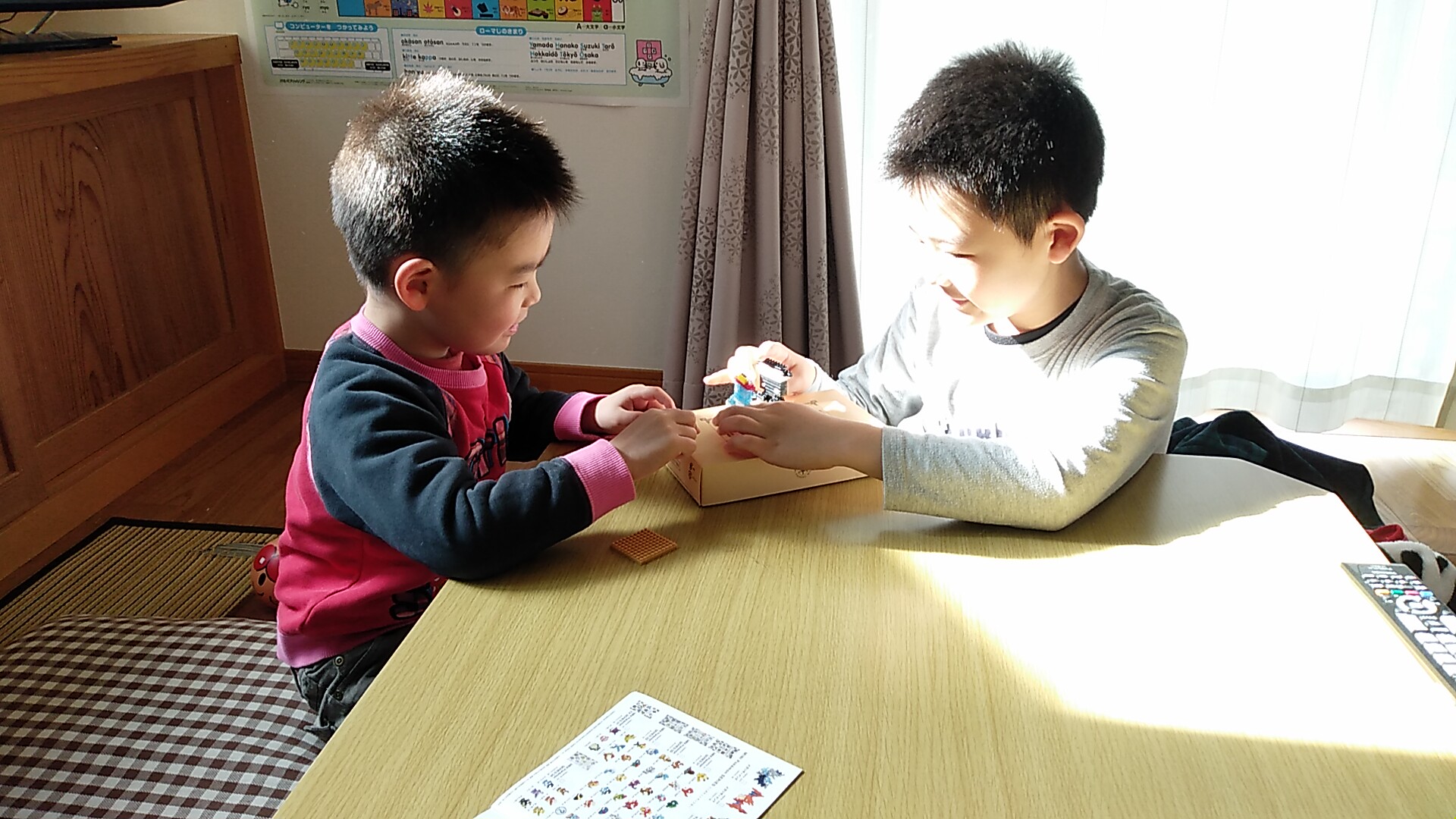 健康優良児の次男は一人で学校に行きました。長男と三男はそんなに体調悪い訳でもなさそうで、朝から二人で楽しそうにブロックで遊んでました。