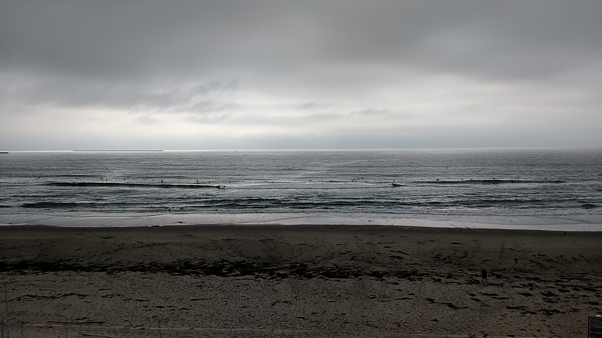 今朝の海がね。天気は時折日が差す曇り空。梅雨っぽいねえ。