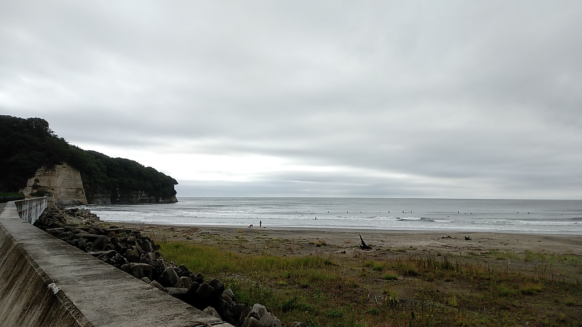 朝起きたらちょっと肌寒い。雨もチラチラでもう秋なのでしょうか?早朝の車ではちょっとだけ暖房つけちゃいましたよ。はじめにチェックした豊間は頭オーバーのオバケセットが炸裂。ゲットハードで誰も海に入ってない。これは私も無理だと判断し、南の岩間海岸を目指す。20分ほど車を走らせてチェック。