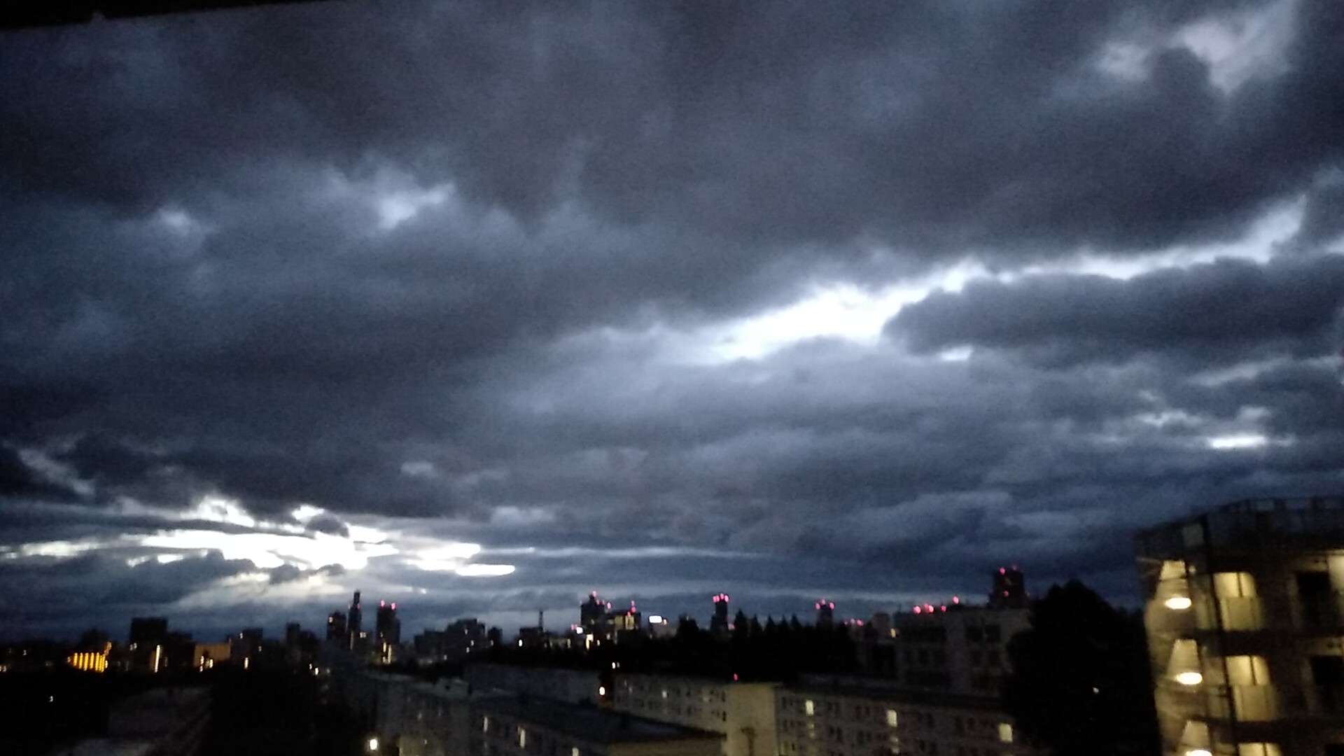 今朝の空の色。雲の間から朝日がチョロッと差す。不思議な青色。