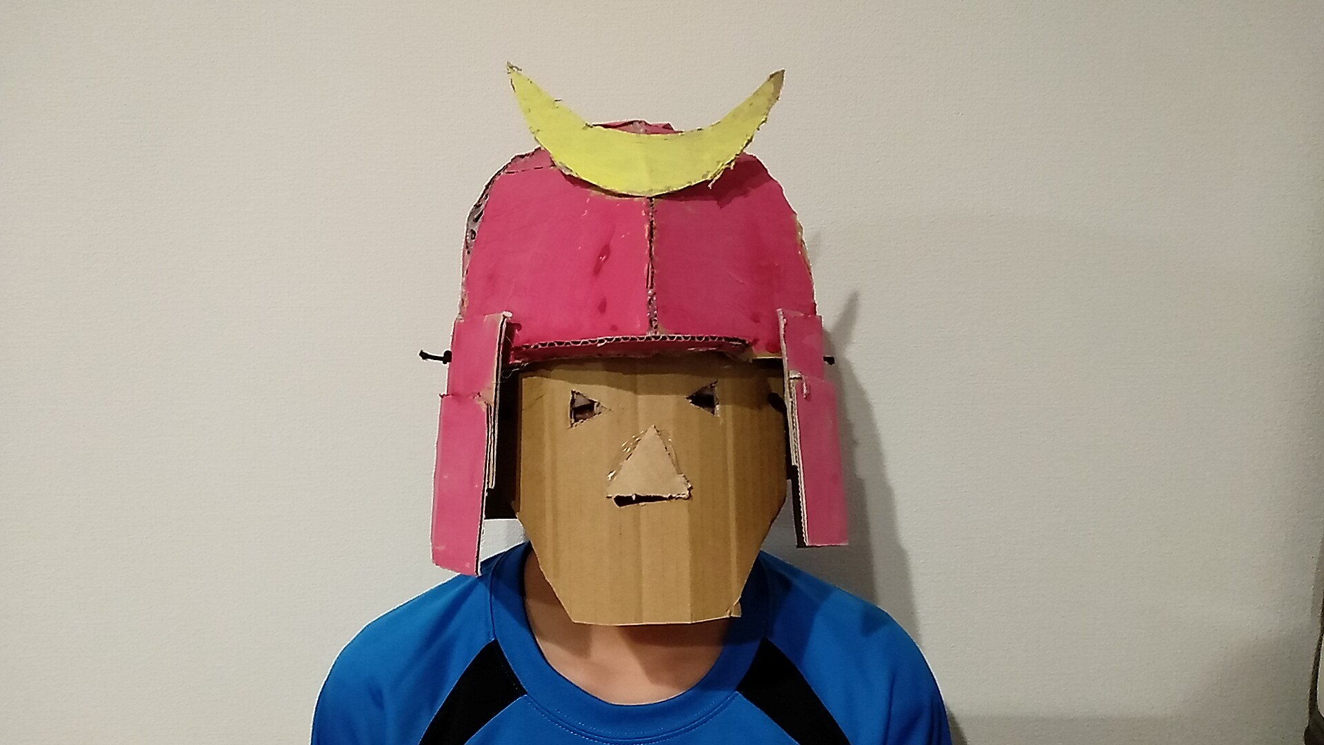週末に長男が段ボールで兜を作った。もちろん防寒用ではない。最近YouTubeで見た映像に影響されてます。