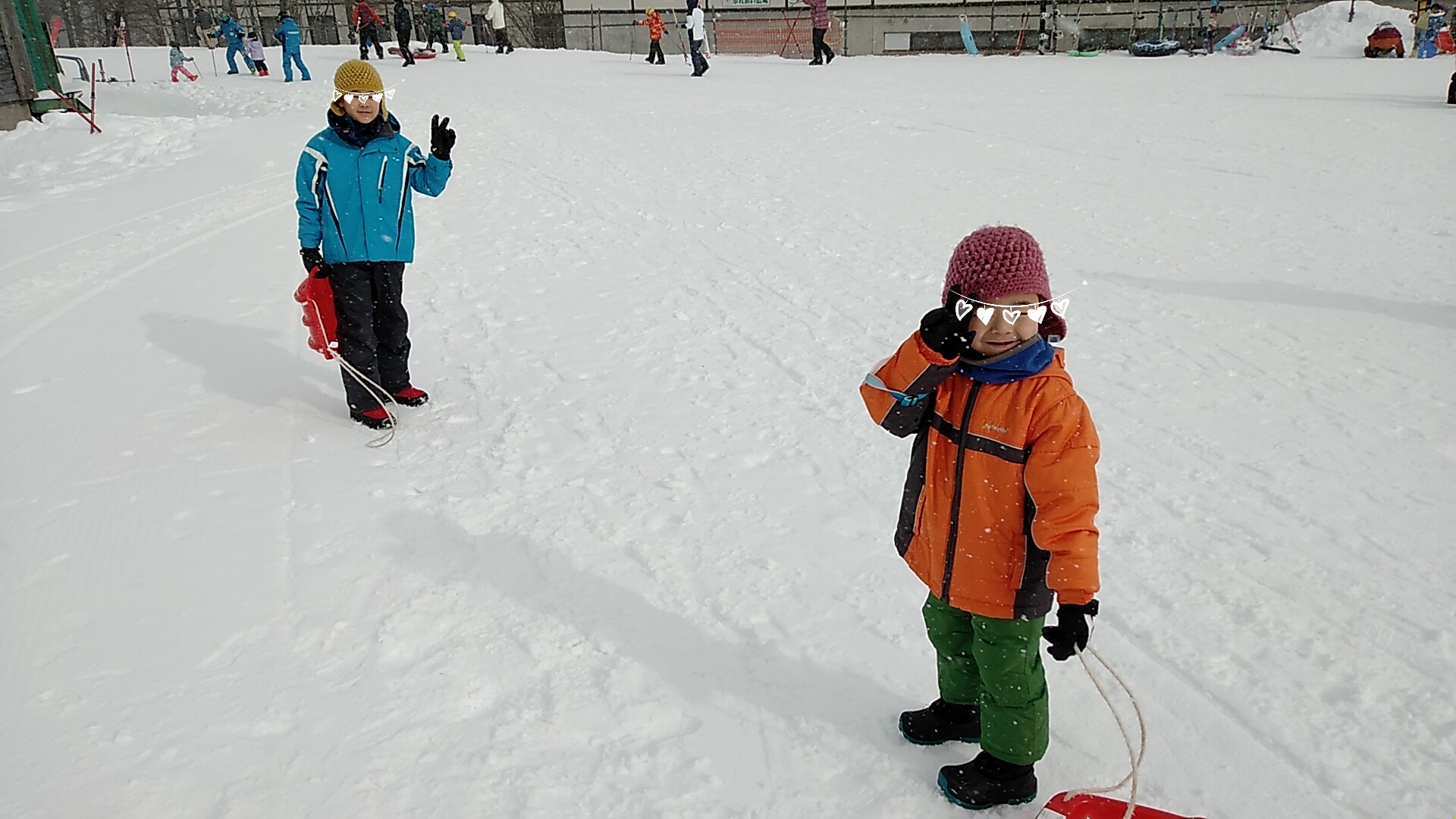 天気は良さそうだけど、昨日よりは気温が低い?山は少し雲がかかって雪が降ってそうだな。11時にスキー場に到着。早速ソリ滑り。