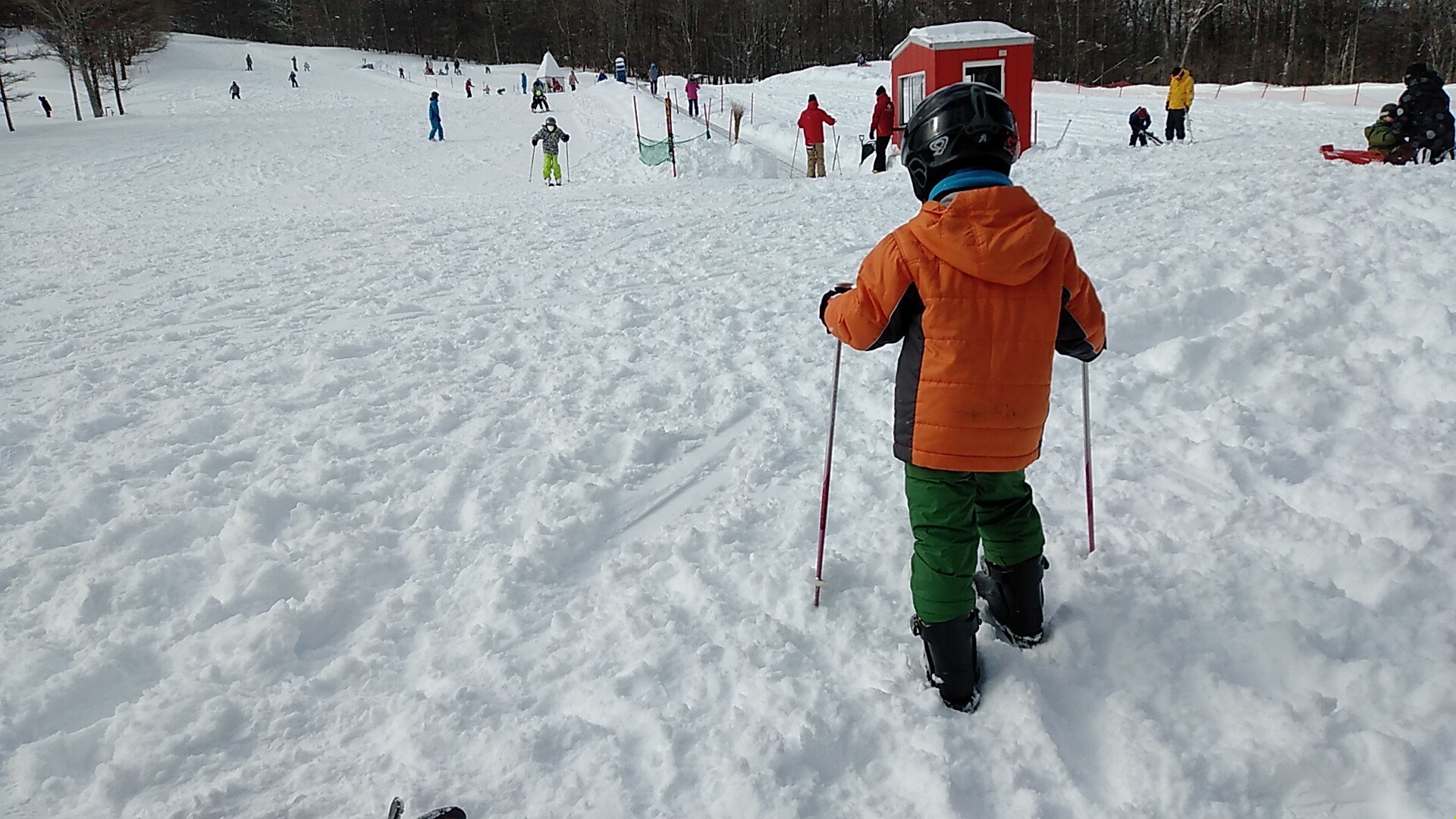 スキーの扱いに苦戦するかと思ったら、歩くのはかなり上手だった。三兄弟の中では1番、スキーの扱いは上手い感じ。滑らせても、まあ、真っ直ぐに行くね。今日は慣れるために何度も緩い斜面を滑りました。最後は一人で滑れるようになった。初めてにしては十分ですね。次回は止まり方を教えようかな。
