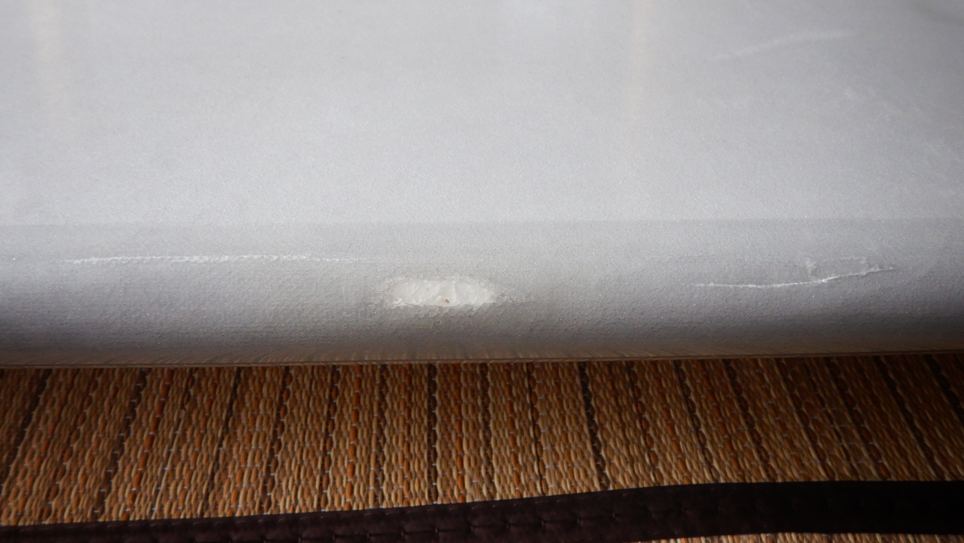 浅い方は補修もいらないかも。深い方は芯材までいってる。これでは水が入ってしまう。丁寧に補修しないとな。