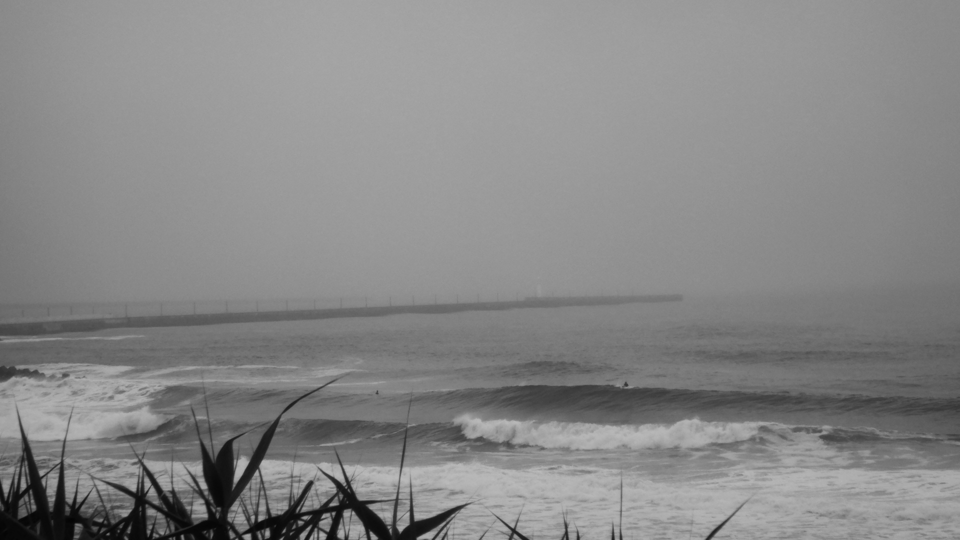 もうすでに2人ぐらいゲットしていたので、その様子を見ながらゲットするラインを探します。北側の防波堤から少し離れたところからパドルアウト。何回か波に飛ばされましたが、思ったよりもすんなりアウトに出れました。出たは良いが、セットはたぶんアタマオーバー。波も厚くて、お化けセットのピークを狙わないと波キャッチできなさそう。今日は1本勝負だな、と心の中で呟きます。入水から30分くらいが過ぎたとき、良さそうな波が来たのでピークを狙ってテイクオフ。立つことには成功したけど、波のパワーに弾かれてすぐ転びました。でも、1本立てたので気持ちに余裕ができて、2本目にロングライド成功!もう満足です。その後も数本トライしましたが、鬼巻かれしてケガしそうになったので終了。1時間ちょっとで2本だけでしたが、1本、まともに乗れただけで大満足の波乗りでした。海から上がる頃には風雨が強くなってきた。
