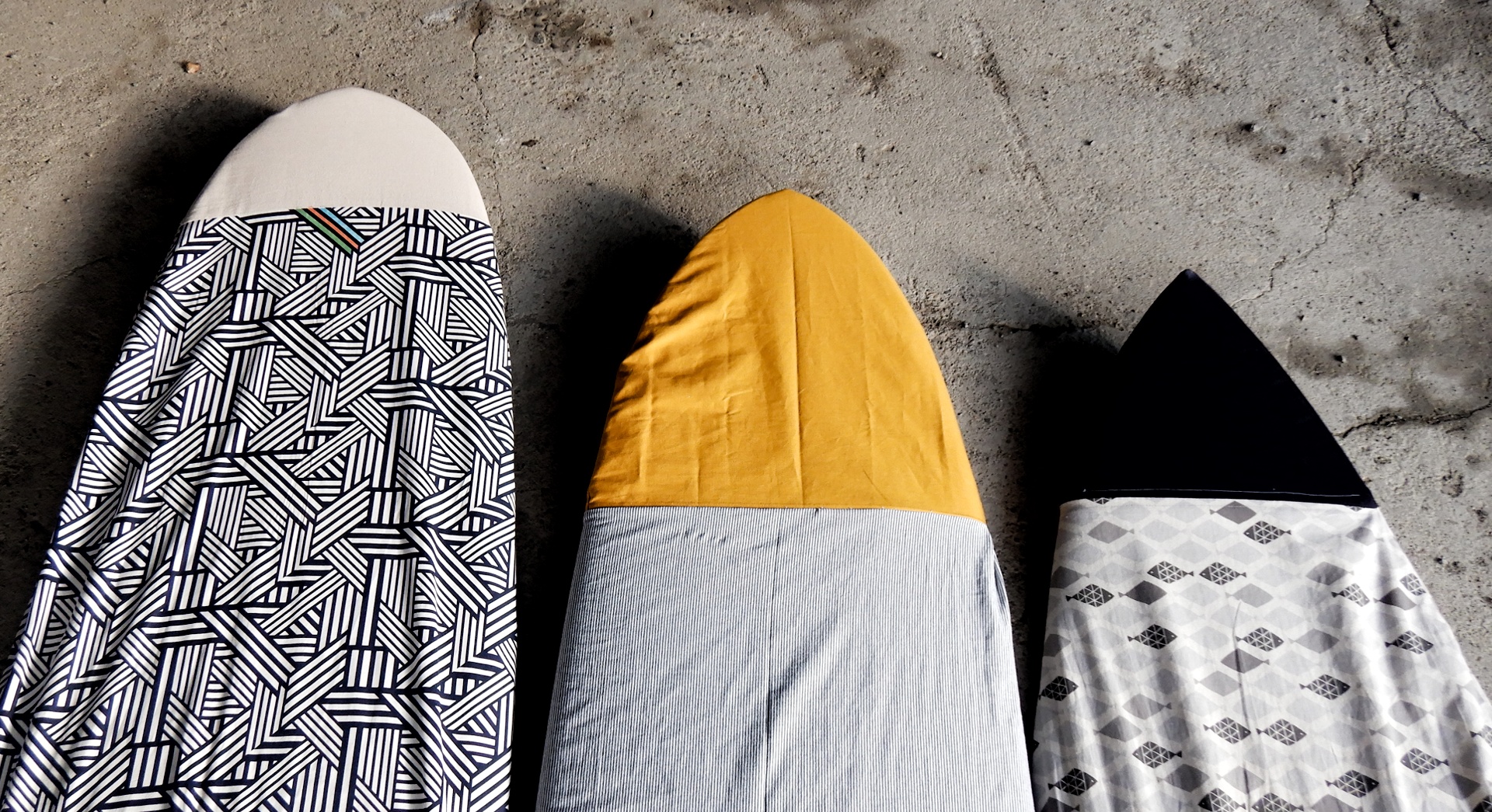 紐で縛ったり、バックルだったり、ゴムだったり。試行錯誤の歴史です。この他にフィッシュとショートもありますね。ケースを作るのも波乗りの一部と言うことで。