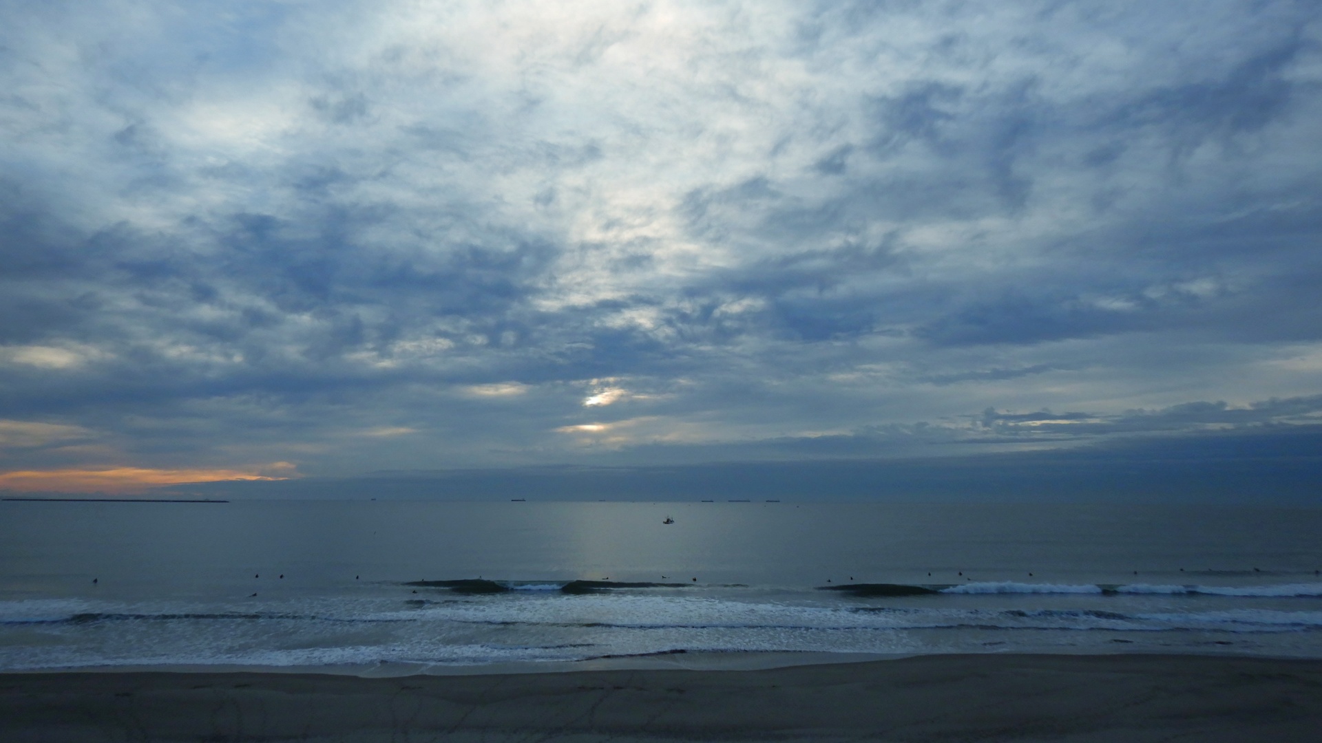 小波!風はオフショアちょっと強め。予定通りMさんにはミッドレングスをお貸しし、新しいフィンを装着。私は今日もロングボードで出陣。港のライトが煌々としていたので、暗いうちにナイター開始です。ウネリは来るけどパワーがなくてロングといえどもテイクオフが難しい。たまーに形良いの来るんだけどね。なかなかそれをキャッチできない。セット間長めでしたが、数本、ウネリからテイクオフしてインサイドまで乗れました。Mさんもミッドレングスの浮力を活かしてテイクオフを決めていました。難しい波でしたが乗れて良かったです。