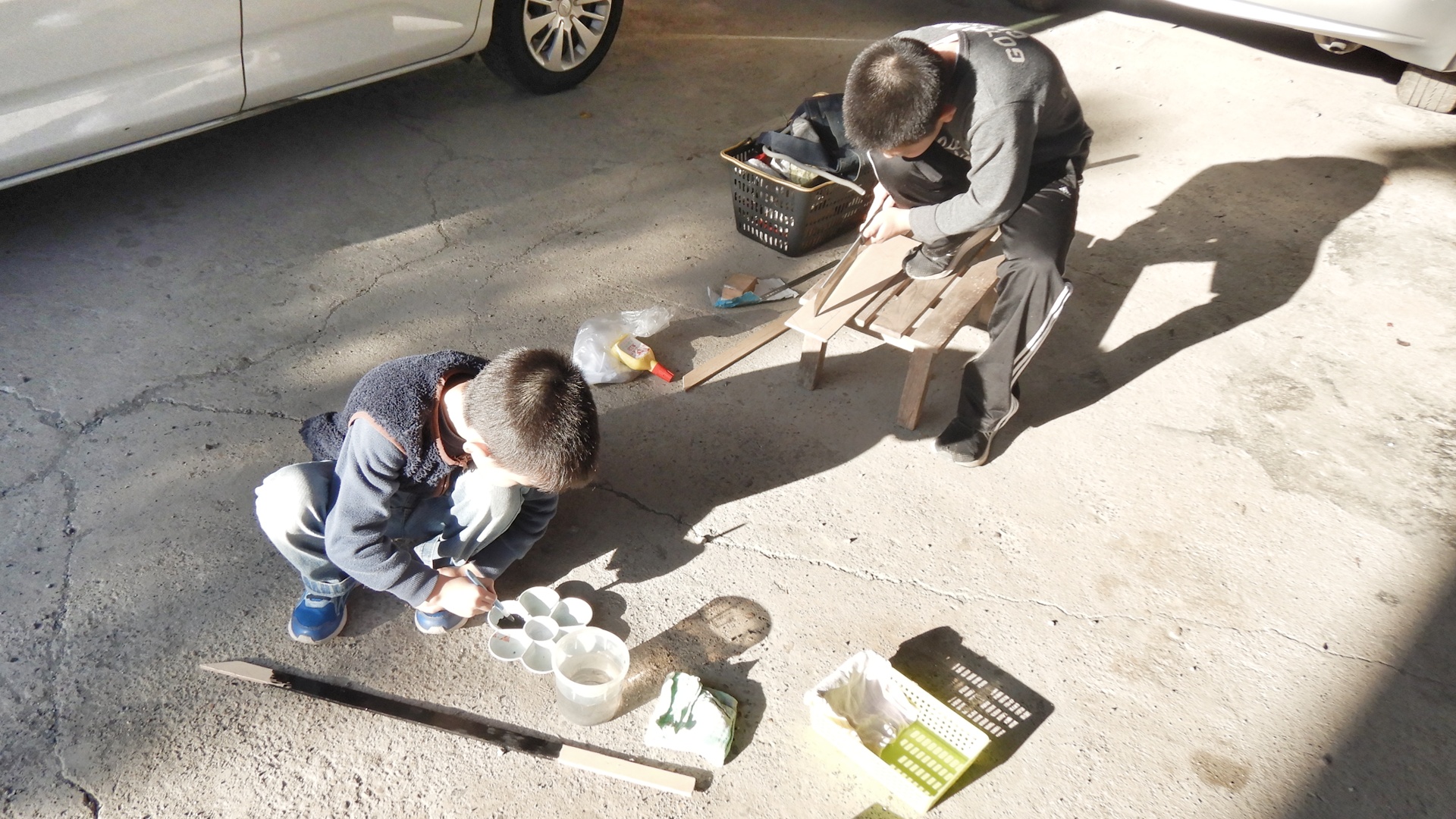 昨日は風があったけど日向はまあまあ暖かく、午後は気温も上がってバイクに乗ってもそれほど寒さは感じなかったな。子どもたちは午前中からボール遊びに興じ、午後からは長男と三男が木材で工作を始めました。私の大工道具を貸して、長男が木材をカットする。カットした材料を、各々着色。