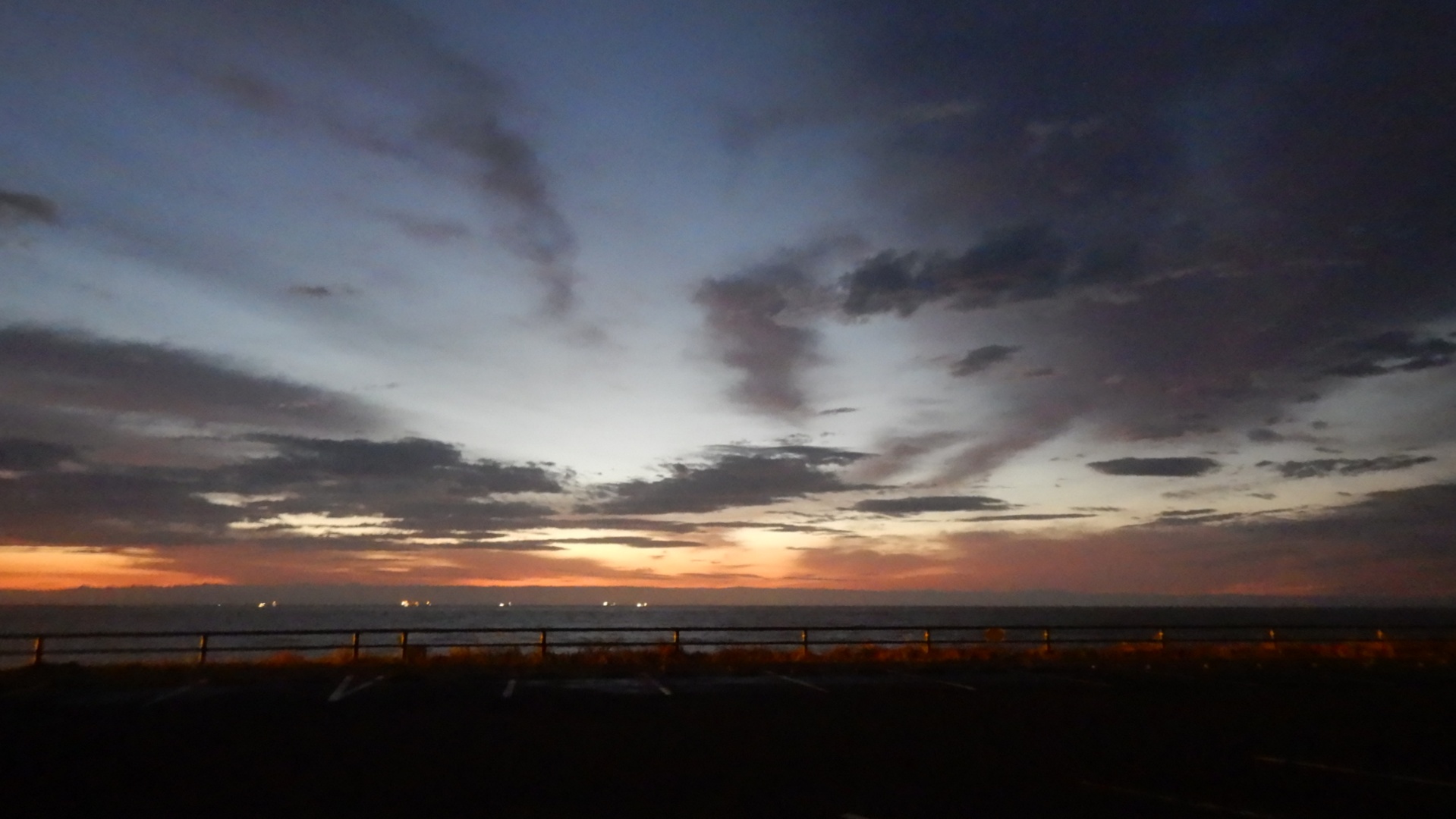 海に向かう途中、車の温度計は14℃を示している。この時期にしては暖かすぎますね。海に着くと南東の風が吹いていて、海はガタガタで、ローカルの人も入るのをためらっているよう。少し明るくなるのを待って波チェックしましたが、やっぱりダメそうなので撤退。この時期に風が南から吹くっていうのは、やっぱり何か天気の変化がある前触れだと思う。