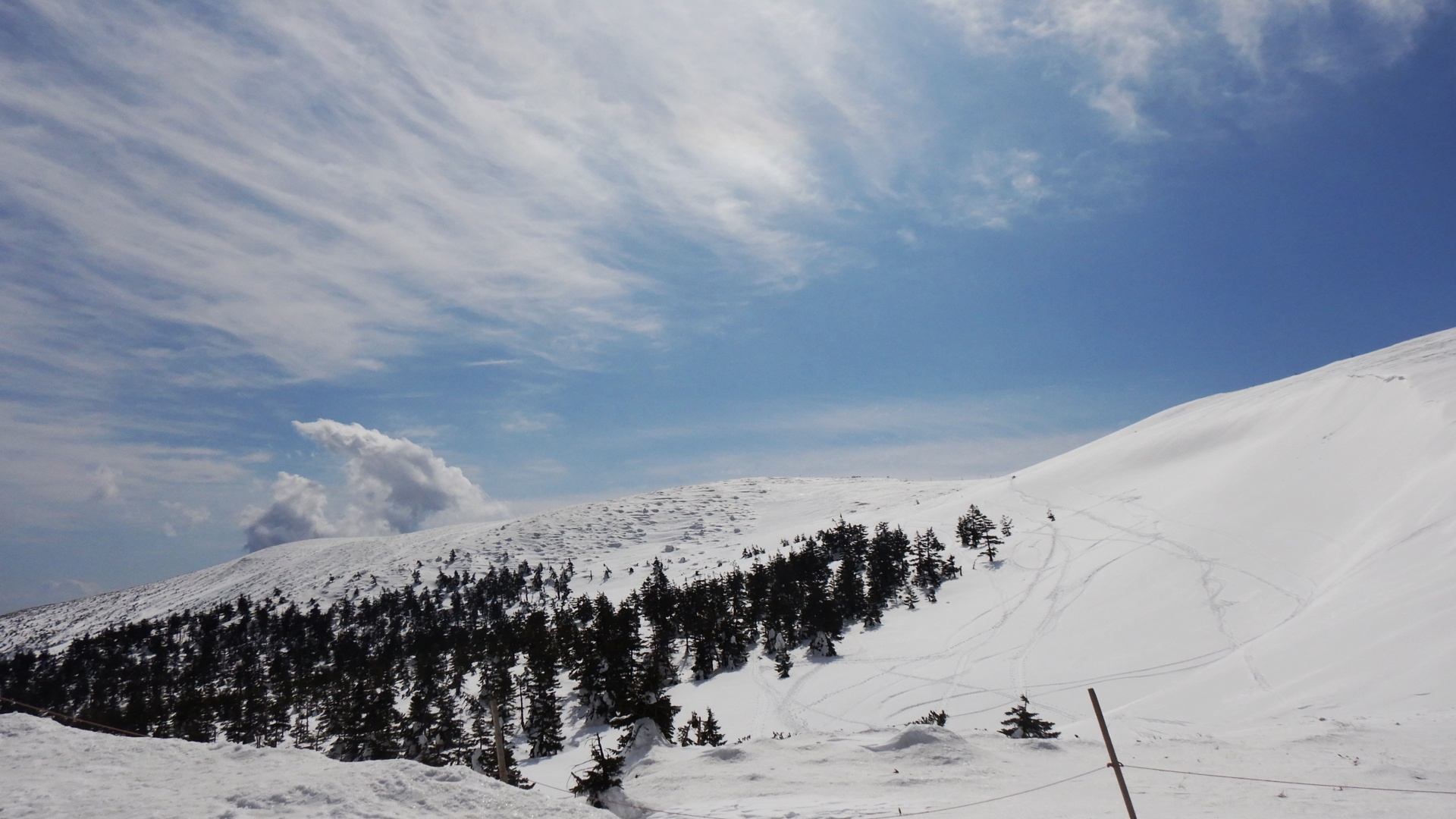 今日はスキーの師匠と2人で滑ります。スキー仲間みんなと連絡を取ると、情報が錯綜するので、今回は2人だけで滑ることにしました。スカイケーブルで上に行き、数本滑るも、数日前の降雪がベトベトで滑りにくい。斜面によって硬かったり、柔らかかったりで、なかなか難しいね、春雪は。せっかくなので、山頂のお地蔵さんにご挨拶に行きます。樹氷もなくなってしまったので、山頂線もガラガラでした。