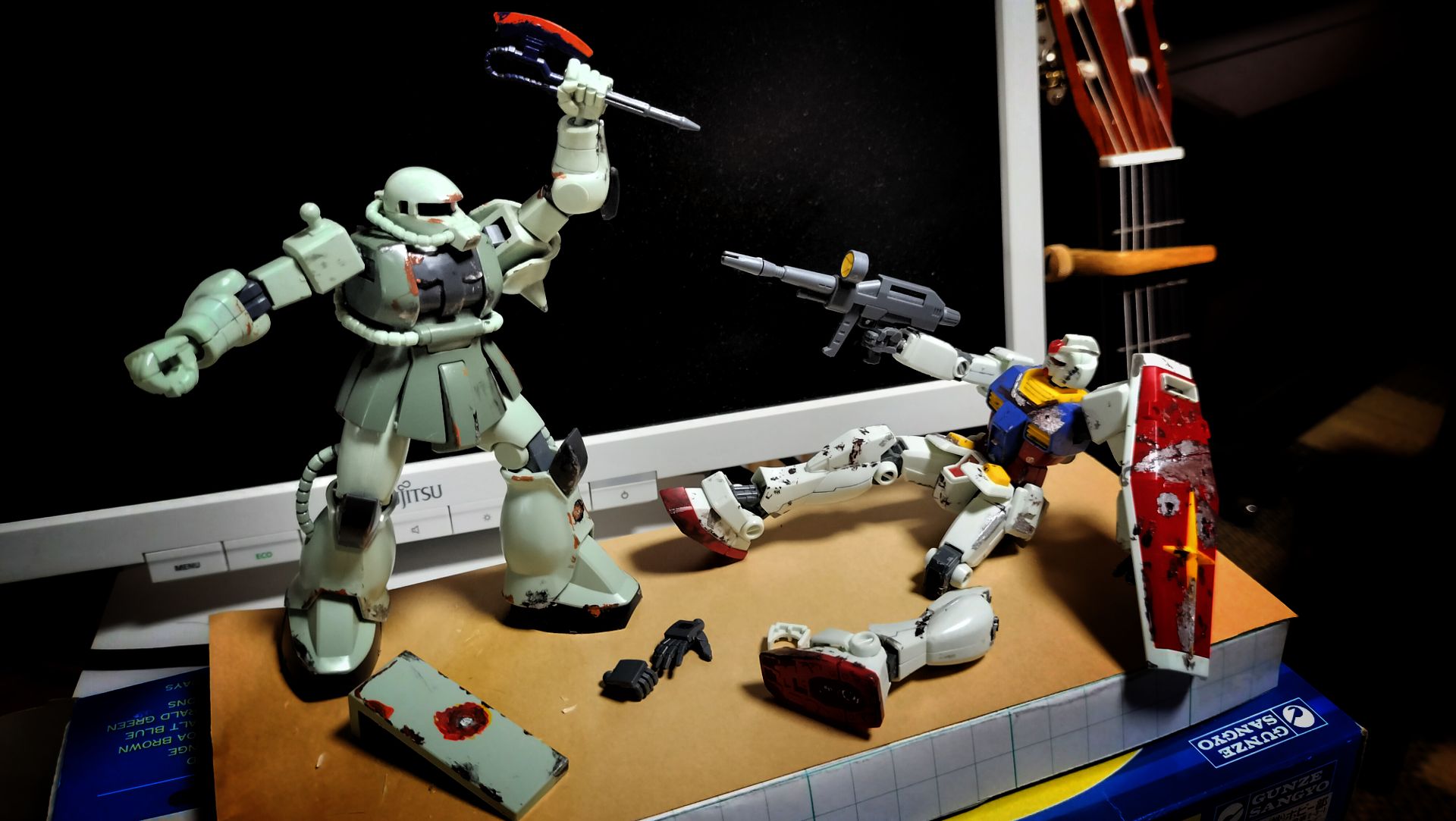 写真は長男がこだわって作ったガンプラの戦闘シーン。本屋さんで買った本を参考に、戦闘による傷や汚れをつけて、リアルさを追求したやつ。使ったペイントは、私が二十代の時に買ったもの。まさか、自分の息子が使うとは思ってなかったね。
