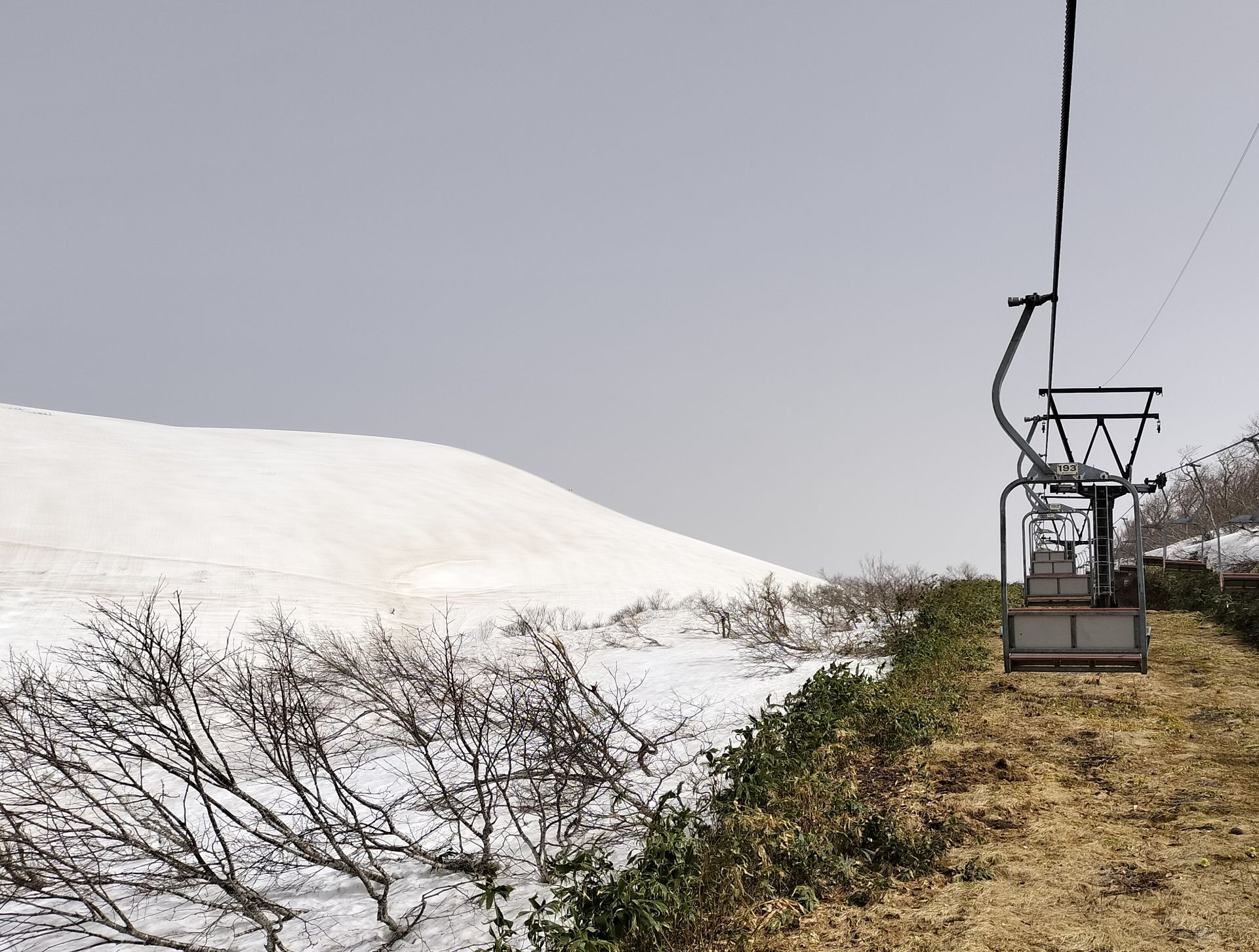 朝5時に福島市を出発。天気が良くて、暑くなりそうな雰囲気があります。高速を北上し、7時過ぎに寒河江で師匠と合流。いざ月山へ。駐車場に着いて8時、すでに暑い。薄着で登り始めます。足慣らしに、スキー場のゲレンデを一本滑る。朝一、板走って最高!ほぼ満足したけど、やっぱり歩かないとな。シールを張ってハイク開始。