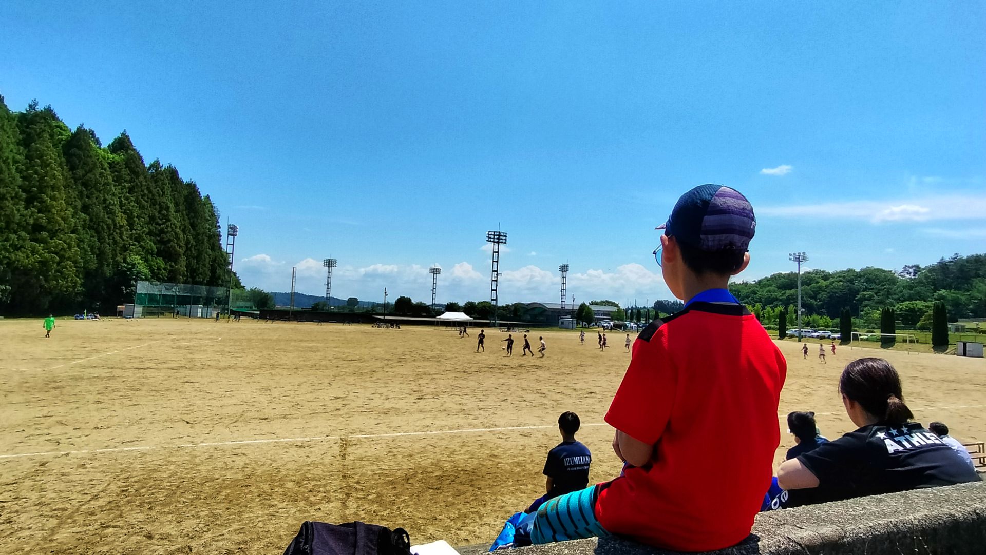 んで、その後すぐに長男のサッカーの試合に向かいます。次男は陸上大会に参加するので、そちらはカミさんが付き添い。三男は、サッカー見たいとのことだったので、私に着いてきました。一試合目は長男のチームが審判などの担当で、その間、三男は暇をもて余す。仕方ないので、運動公園内を散策。