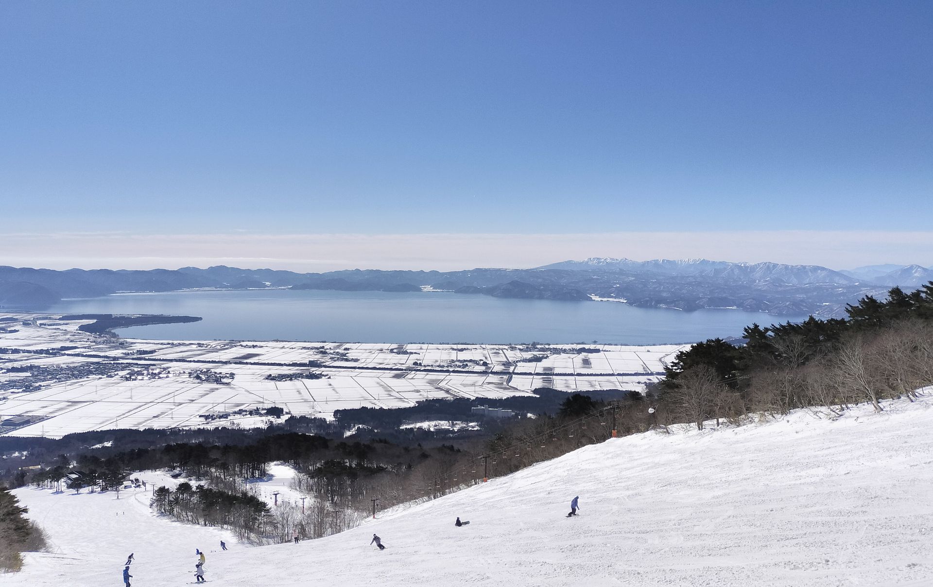 朝イチのバーンはかなり硬く、数本で太ももに疲労がたまりましたが、天気はめちゃくちゃ良かったので、10時くらいにはかなり緩んで滑りやすくなった。自分の体の癖を意識しながら、外脚との距離感が遠くなりすぎないよう滑る。中盤から調子良くなってきたので、国体コースの上部から連絡路を渡って中央エリアへ。猪苗代湖が丸見えの絶景コース。ツアースキーみたいで良いな。